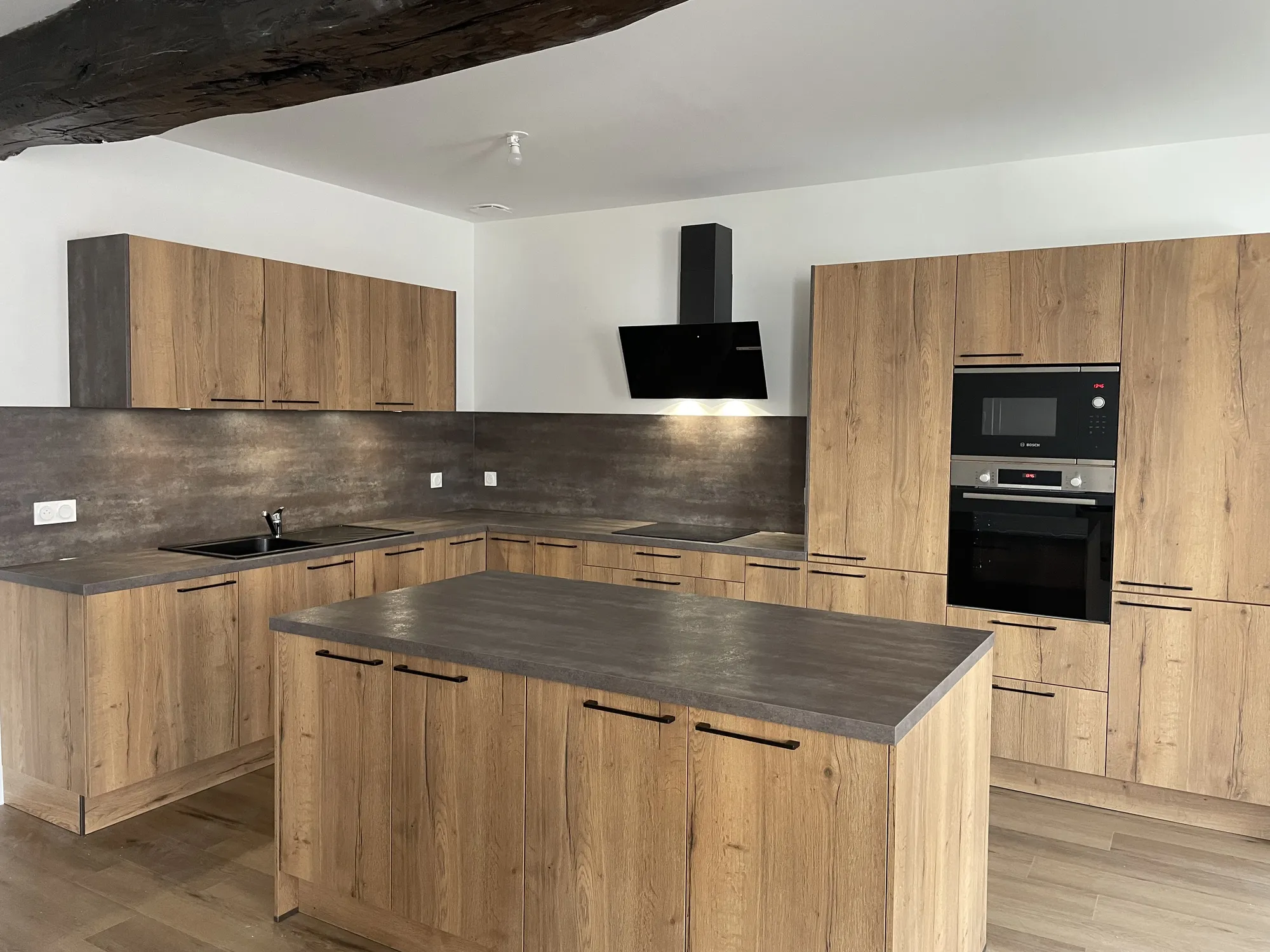 Le plan de travail stratifié - coloris oxyde - apporte une touche minérale et industrielle, en contraste subtil avec les façades chaleureuses.